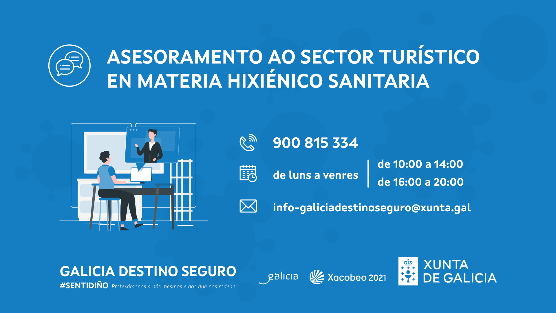 La Xunta habilitará desde mañana un teléfono gratuito para resolver las dudas del sector turístico en materia de seguridad sanitaria. Las empresas y profesionales que lo deseen podrán llamar al 900 815 334 de lunes a viernes, en horario de 1.00 a 13.00 horas y de 16.00 a 20.00 horas o enviar un correo electrónico a info-galiciadestinoseguro@xunta.gal.