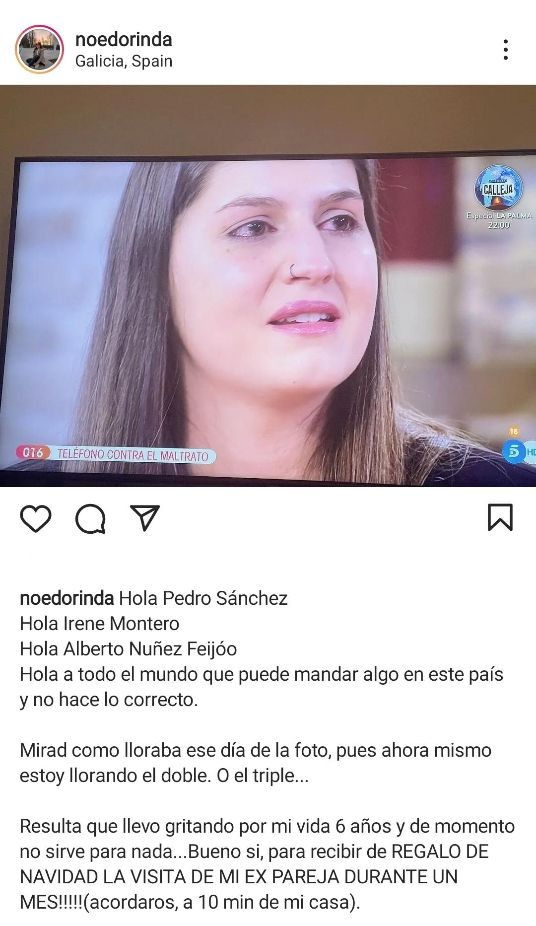 "Mi vida va a estar en total peligro un mes, estoy acojonada mientras él se pasea por la zona con la cabeza bien alta", continúa. En su mensaje -que suma 8.500 ‘likes’ en Instagram y ha sido muy compartido- pide ayuda a Pedro Sánchez, a Irene Montero, a Alberto Núñez Feijóo y "a todo el mundo que puede mandar algo en este país y no hace lo correcto".
