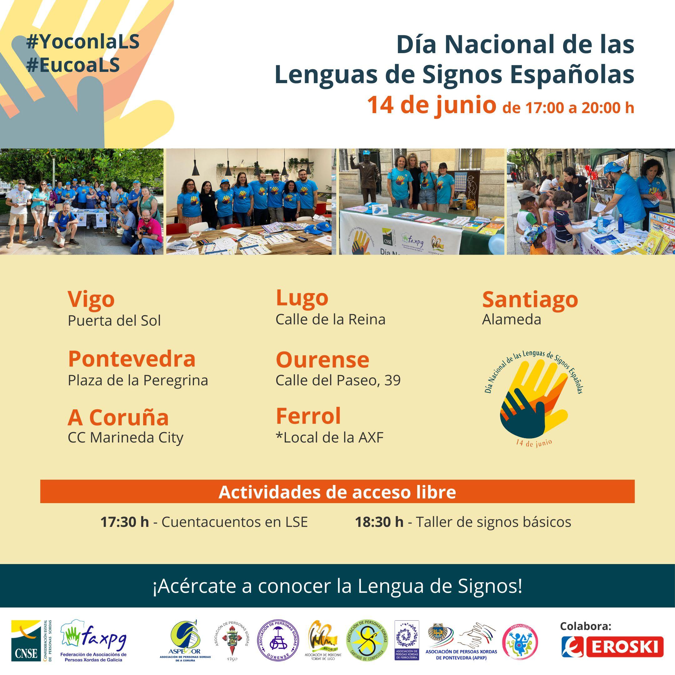 Galicia celebra este miércoles 14 de junio el Día Nacional de Lenguas de Signos Españolas, una fecha señalada en la que la Federación de Asociacións de Persoas Xordas de Galicia (FAXG) quiere visibilizar esta lengua ante la sociedad y revindicar los derechos lingüísticos del colectivo. Mesas informativas, cuentacuentos para los más pequeños de la casa y talleres para aprender signos básicos. Estas son algunas de las principales actividades programadas por la FAXG, que se desarrollarán desde las 17:00 hasta las 20:00 horas en las siguientes localizaciones: