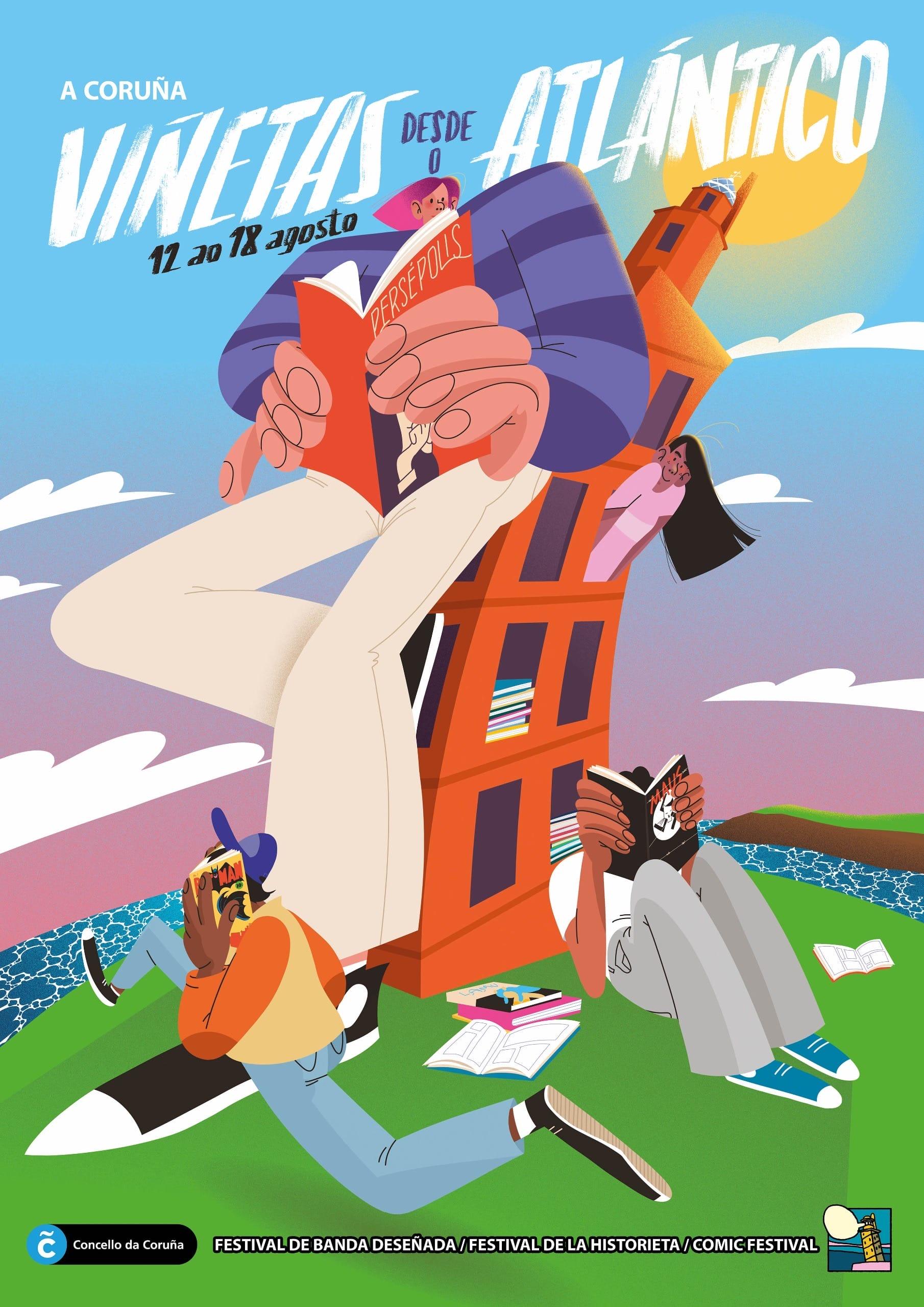 Ese estilo lo ha trasladado al cartel de la nueva edición. La Torre de Hércules vuelve a ser la protagonista de la imagen como cada año, este año coincidiendo con el 15 aniversario de su declaración como Patrimonio de la Humanidad. En esta ocasión se convierte en el centro de reunión de diversos personajes cuyo punto de unión está en la lectura del cómic, como elemento de entretenimiento, aprendizaje, conocimiento y herramienta de inclusión social.