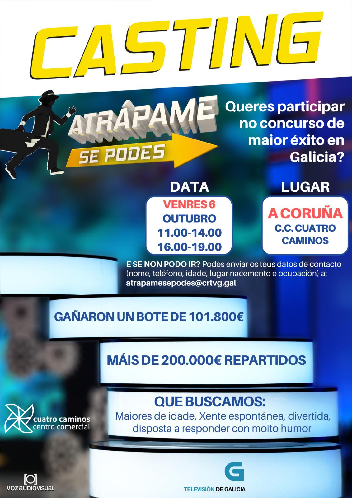 El concurso de mayor éxito en Galicia, Atrápame se podes, busca concursantes en A Coruña. Este viernes habrá un casting en el Centro Comercial de Cuatro Caminos en horario de mañana y tarde.
