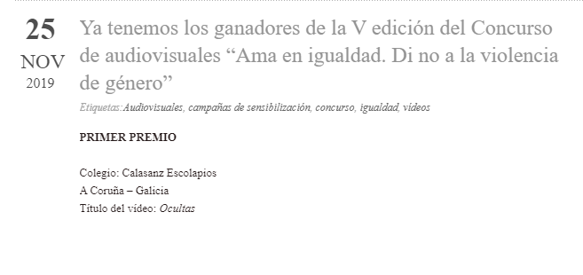 Con un vídeo titulado "Ocultas", los alumnos del colegio Calasanz Escolapios de A Coruña han merecido el primer premio de la quinta edición del concurso "Ama en Igualdad. Di no a la violencia de género" en el que competían con colegios de toda España.