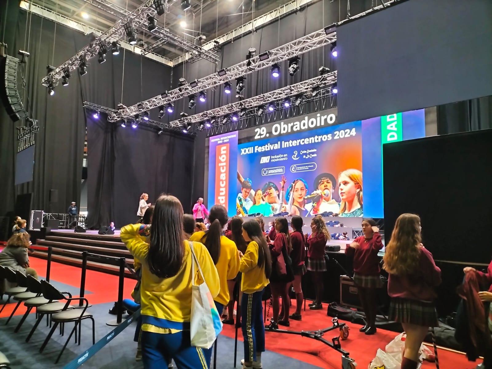Precisamente, el Colegio Obradoiro también estaba este mediodía en el Coliseum para rematar la espectacular actuación que han preparando con mucho cariño. "Hay muchos nervios, pero espero que salga bien porque lo llevamos preparando desde hace mucho tiempo", decía la alumna de 2º de Bachillerato, Águeda Santo Romero.