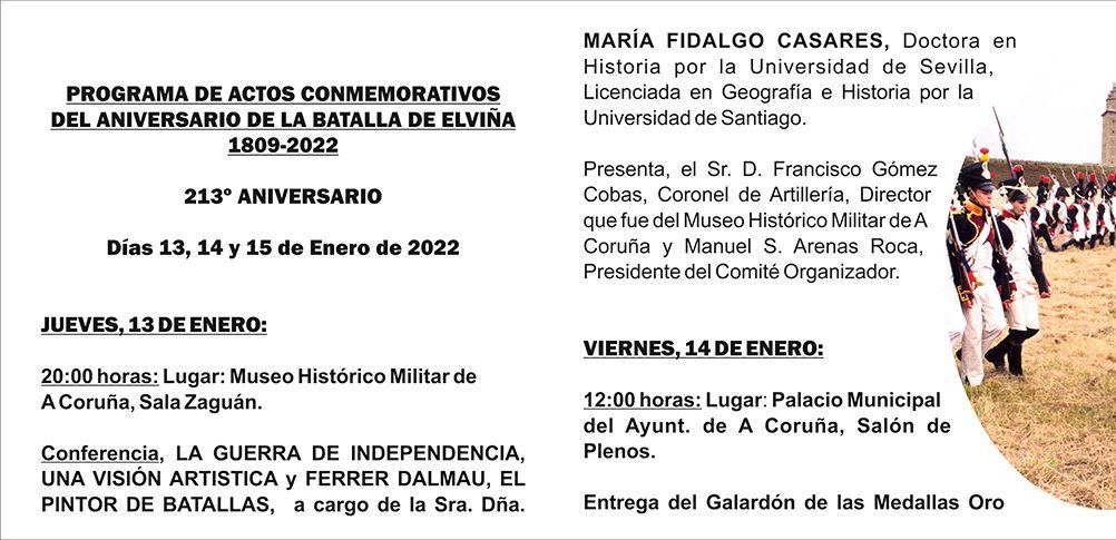 La celebración continuará al día siguiente a las 12:00 horas en el Palacio Municipal del Ayuntamiento de A Coruña. En el Salón de Plenos se hará entrega de las Medallas de Oro Conmemorativas de la Batalla de Elviña 1809-2022 a la historiadora María Fidalgo, al articulista e investigador Iván Fernández Amil, y a la Cruz Roja de A Coruña.
