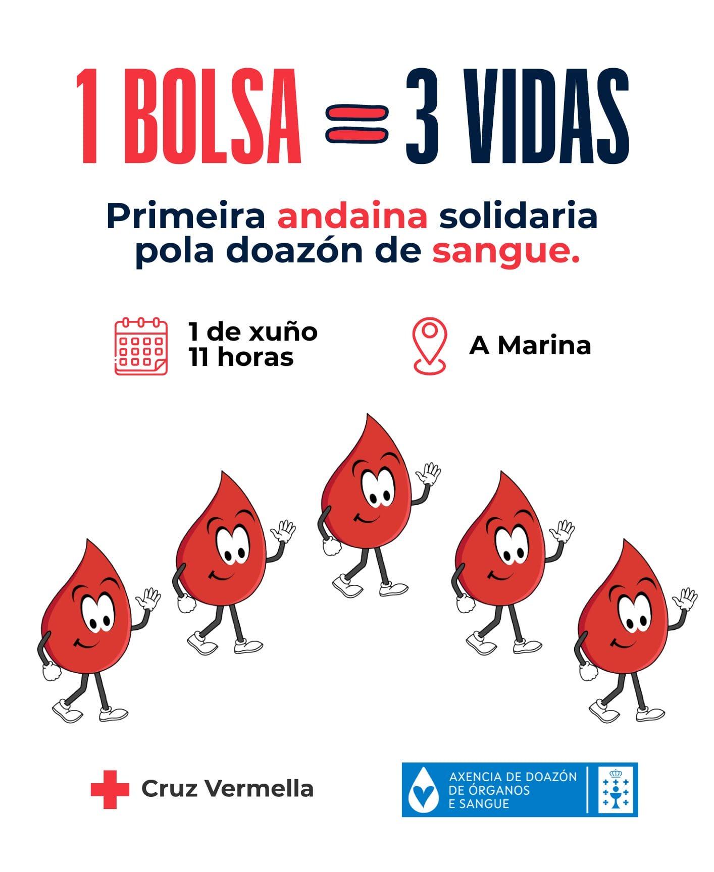 La primera marcha solidaria por la donación de sangre en A Coruña tendrá lugar este sábado, 1 de junio, a las 11:00 horas de la mañana en la zona de A Marina y el Parrote. "Una sola bolsa de sangre puede salvar tres vidas" es el motivo por el que el alumnado del Centro de Formación de Cruz Roja organiza esta marcha con el lema de "1 bolsa 3 vidas".