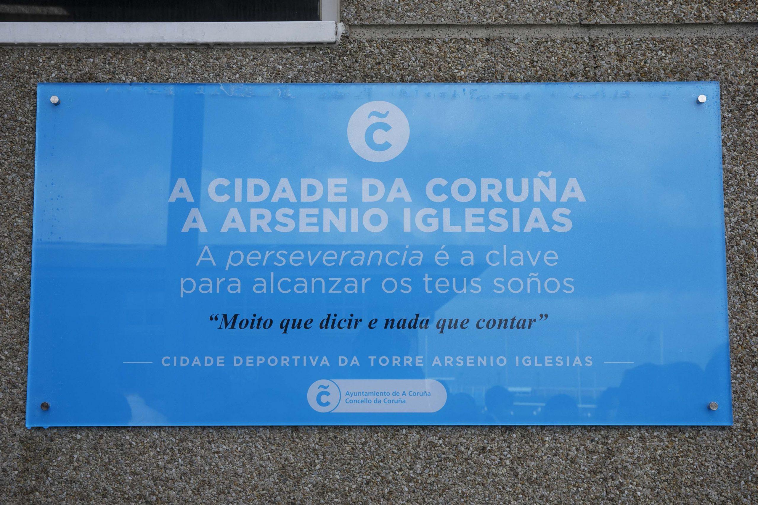 La esposa del deportivista, Carmen Vázquez, y la alcaldesa de la ciudad, Inés Rey, fueron las encargadas de descubrir la placa que lo homenajea. "La ciudad de A Coruña a Arsenio Iglesias. La perseverancia es la clave para alcanzar tus sueños", puede leerse en gallego en la placa. Este elemento también recoge una de las frases más conocidas del exentrenador, "Mucho que decir y nada que contar", lo primero que Iglesias dijo en la rueda de prensa posterior al fallido penalti de Djukic.