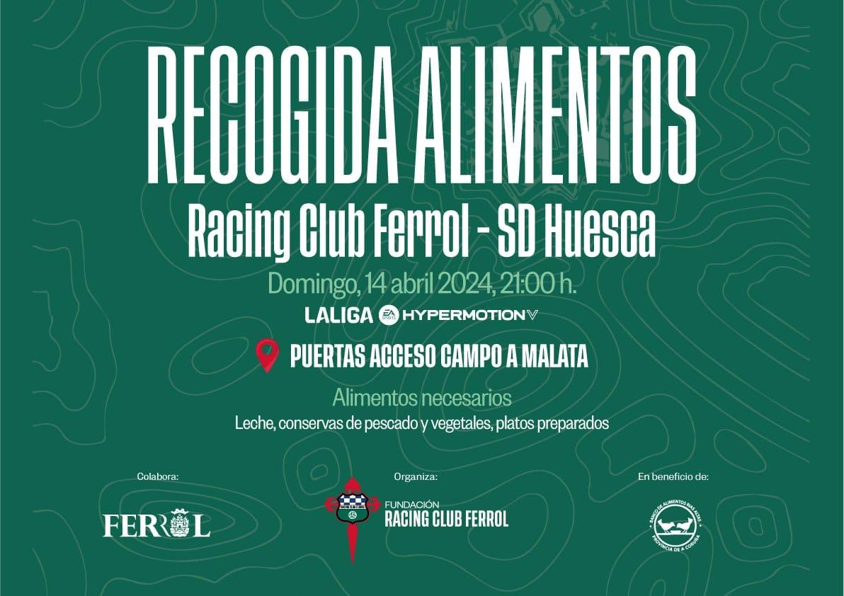 La Fundación Racing Club Ferrol ha convocado para este domingo una recogida de alimentos a favor del Banco Rías Altas con motivo del partido que tendrá lugar este domingo, 14 de abril, a las 21:00 horas en el estadio de A Malata para enfrentar al equipo local contra el SD Huesca.