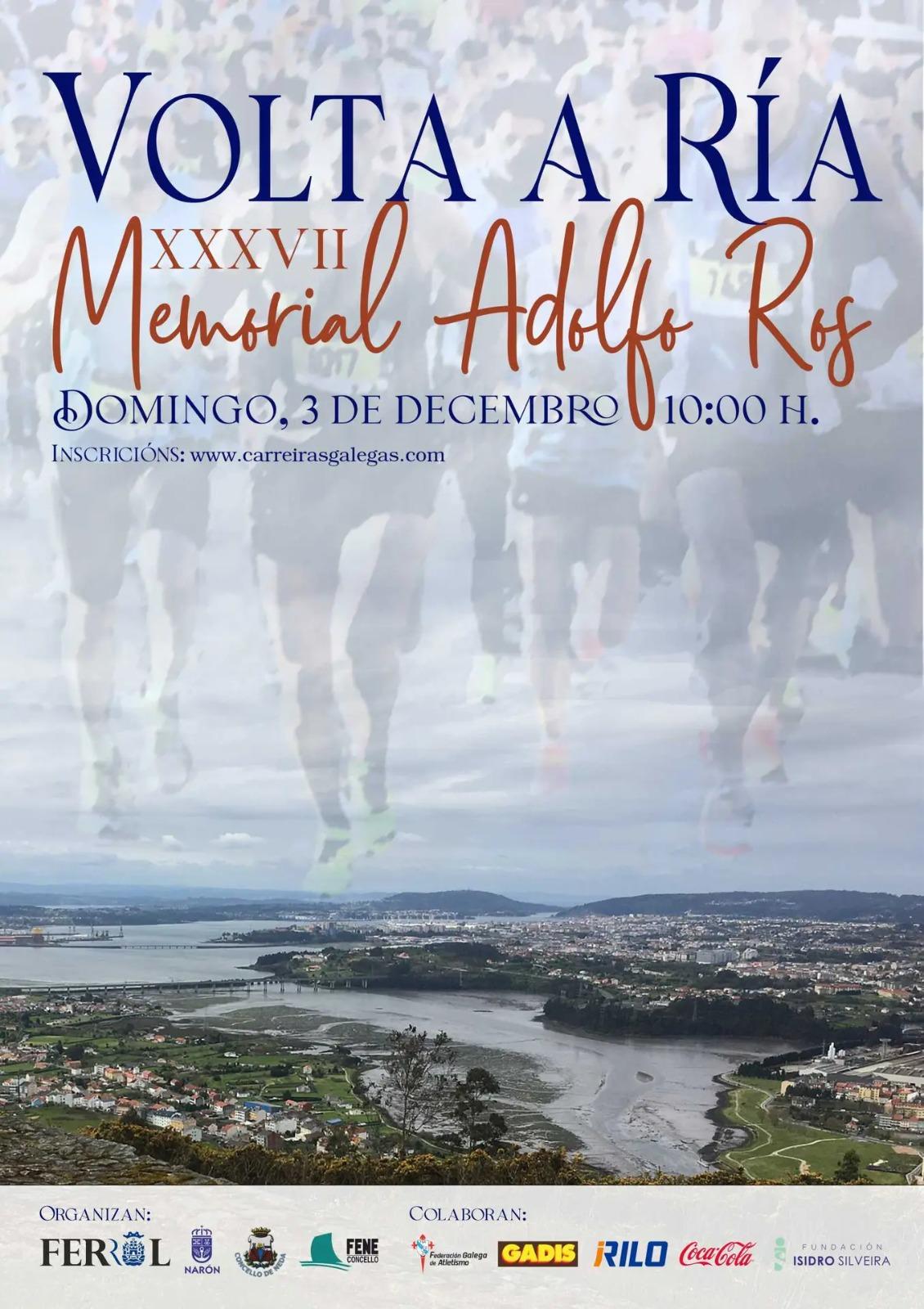 La XXXVII media maratón ‘Memorial Adolfo Ros-Volta á Ría’ se celebrará el domingo 3 de diciembre, a partir de las 10:00 horas, y partirá y terminará en Ferrol, en las inmediaciones de la plaza de España. El evento está organizado por los concellos de Ferrol, Narón, Neda e Fene, municipios por los que pasa la prueba.