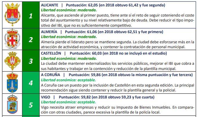 Encabezan el ranking de 2019 Alicante, Almería, Castellón y A Coruña. Sigue a A Coruña, Vigo. Cierran este año la tabla Alcorcón, Granada, Tarragona y Marbella. Además, destaca el suspenso que reciben las mayores ciudades del país por población: Madrid, Barcelona, Valencia y Sevilla, mientras que las ciudades gallegas se posicionan en los primeros puestos de la clasificación.