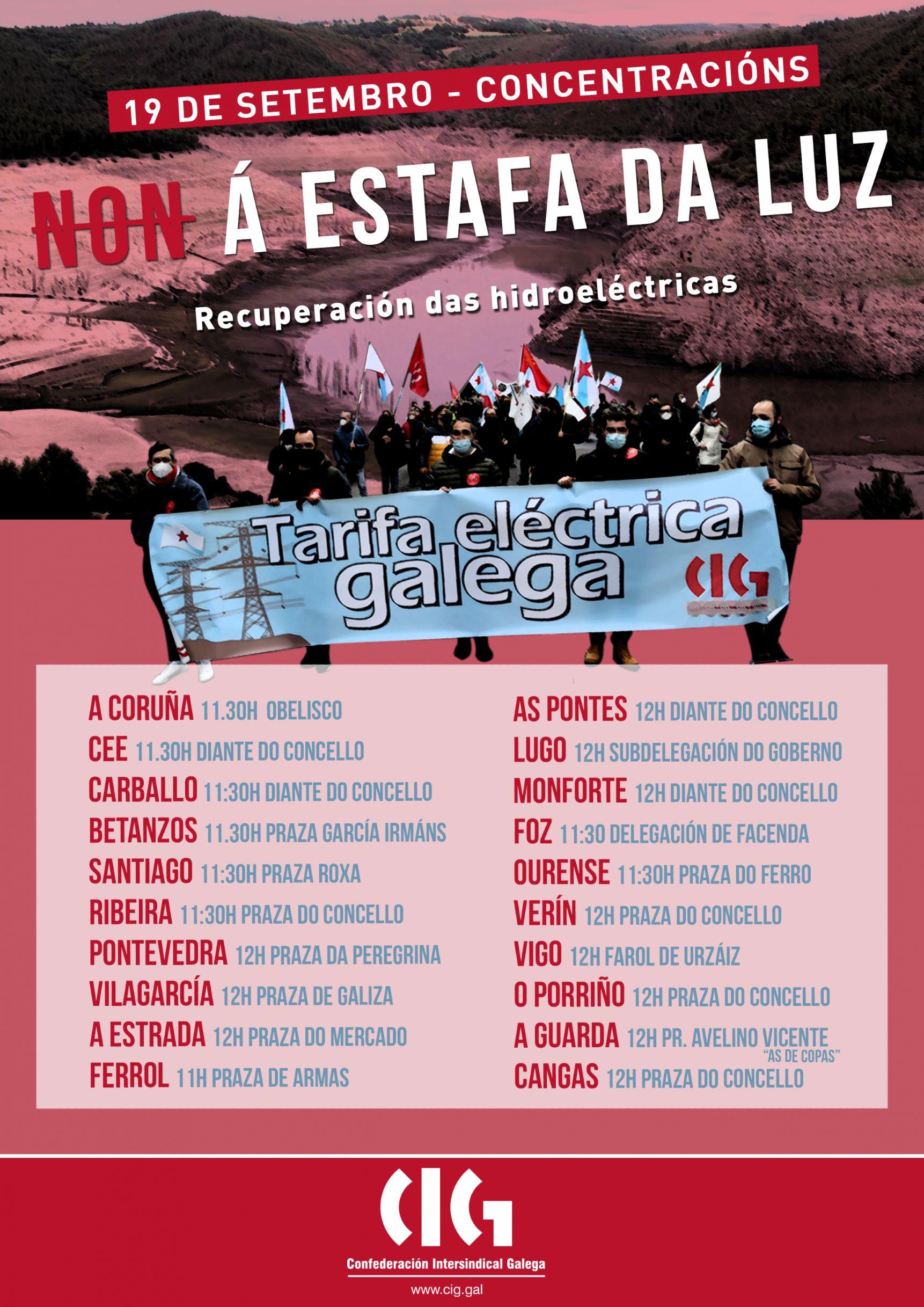 La CIG hace un llamamiento para participar en las movilizaciones convocadas en oposición a la subida del precio de la luz el próximo 19 de septiembre en diferentes localidades gallegas bajo el lema "Non á estafa da luz, recuperación das centrais hidroeléctricas, tarifa eléctrica galega".
