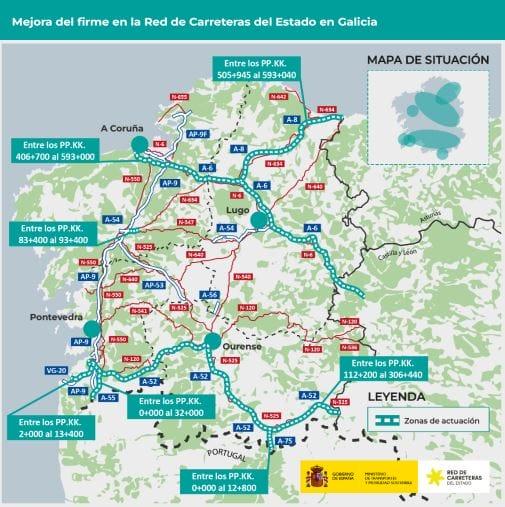 En concreto, se van a llevar a cabo 1.145 actuaciones a lo largo de 534 km de las autovías A-6, A-8 y A-54, en las provincias de A Coruña y Lugo. Mientras que en Ourense y Pontevedra se rehabilitará la A-52, A-75, A-55 y VG-20,