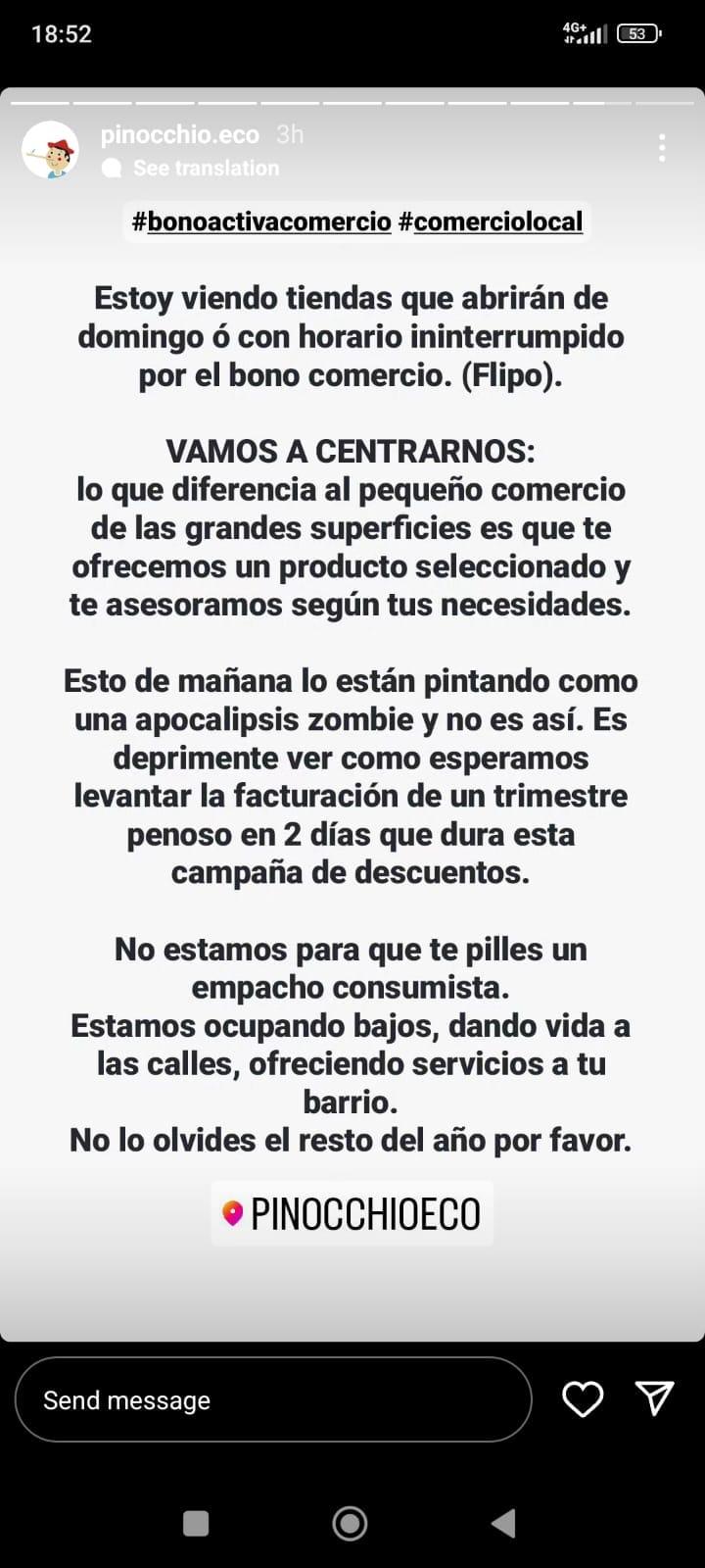Alexandra, de la tienda coruñesa Pinocchio & co, se ha mostrado en contra de la campaña de los bonos de la Xunta en las redes sociales de su negocio. "Le estamos dando la vuelta en nuestra contra a la campaña del bono comercio, porque en lugar de fomentar el negocio de barrio nos estamos conformando a lo que es habitualmente el funcionamiento de las grandes superficies", explica.