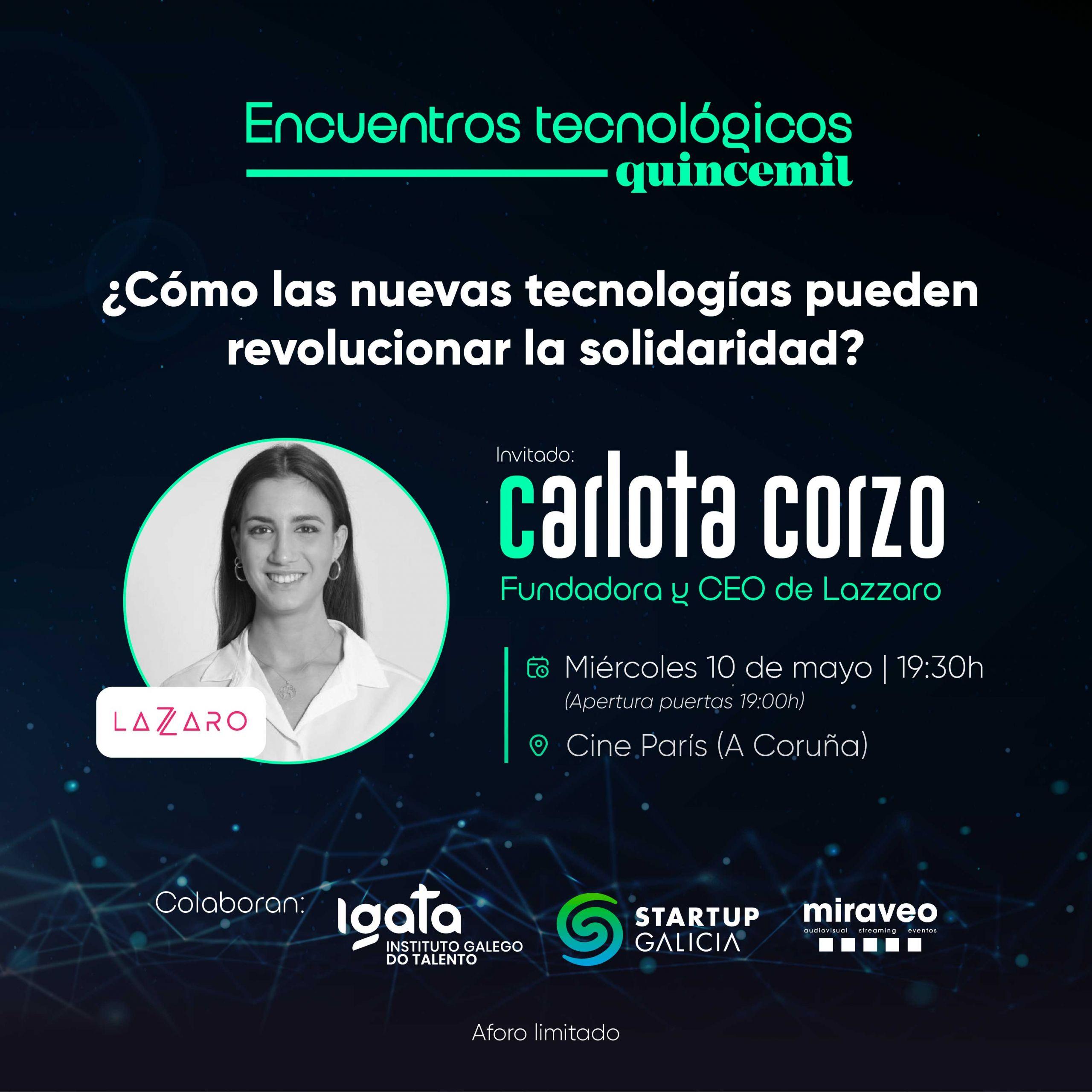¿Cómo pueden las nuevas tecnologías revolucionar la solidaridad? Carlota Corzo, CEO y fundadora de Lazzaro, nos lo contará el próximo miércoles 10 de mayo en el quinto Encuentro Tecnológico Quincemil, en el Cine París de A Coruña. La emprendedora coruñesa ha sido la única mujer gallega de la lista 30 Under 30 de Forbes, con la que la famosa publicación económica destaca a las 30 personas menores de 30 años más prometedores del panorama emprendedor español.