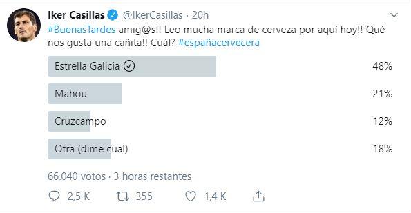 El propio Iker Casillas, ex portero de la Selección española, se dio cuenta del revuelo que estaba originando la publicación de los resultados de la encuesta de DataCentric y él mismo publicó su propia encuesta, en la que también gana Estrella por goleada: casi la mitad de las personas que respondieron la encuesta marcaron la casilla de la cerveza coruñesa.