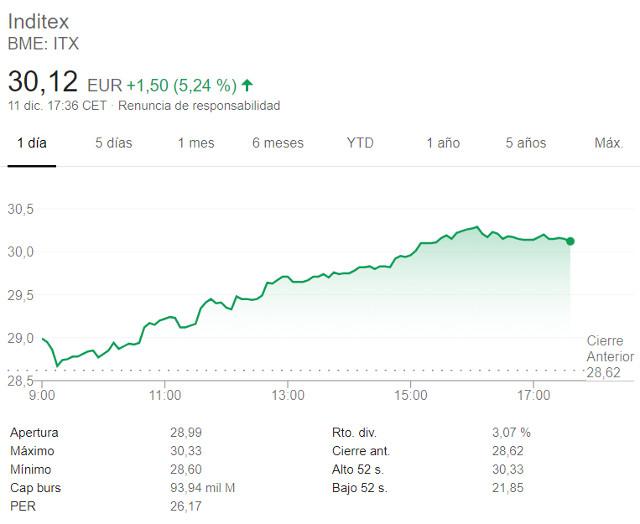 Las acciones de Inditex se revalorizan un 5,24%, superan de nuevo los 30 euros y vuelven a niveles de 2017