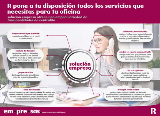Y para eso disponemos del servicio Solución Empresa de R. Se trata de una solución flexible y personalizable que podéis adaptar a las necesidades de vuestra empresa. Incluye internet, líneas de voz, terminales, soluciones de telefonía para llamadas a fijos y móviles, funcionalidades avanzadas de centralita y mantenimiento preferente para empresas.