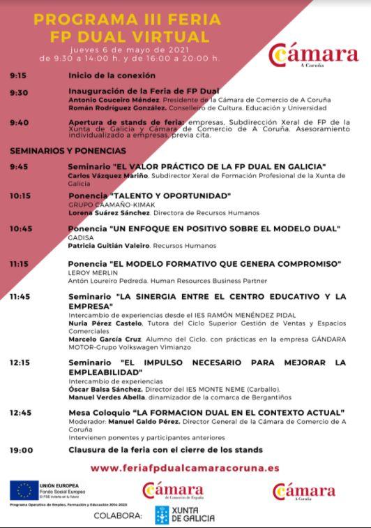 Por su parte, durante toda la jornada, tanto la Cámara como la Xunta de Galicia a través de la consellería de Cultura, Educación e Universidade, resolverán en sus respectivos stands virtuales las dudas que las empresas puedan tener sobre esta modalidad educativa. Además, empresas que ya han implantado la FP Dual contarán con un espacio virtual para explicar su experiencia a otras empresas, alumnos y profesorado interesados en la materia.