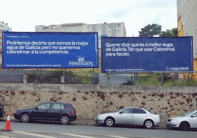 "Para campaña que nos dan feita, á que temos a dereita" y "querer dicir que es a mellor auga de Galicia. Ter que usar Cabreiroá para facelo". Estos son los mensajes que lucen en A Coruña en dos vallas publicitarias de Cabreiroá en la ciudad herculina y que son una ácida respuesta a la campaña publicitaria iniciada por el agua gallega Fontecelta con el mensaje: "Podríamos decirte que somos la mejor agua de Galicia pero no queremos cabreiroar a la competencia", en clara alusión a la marca Cabreiroá.