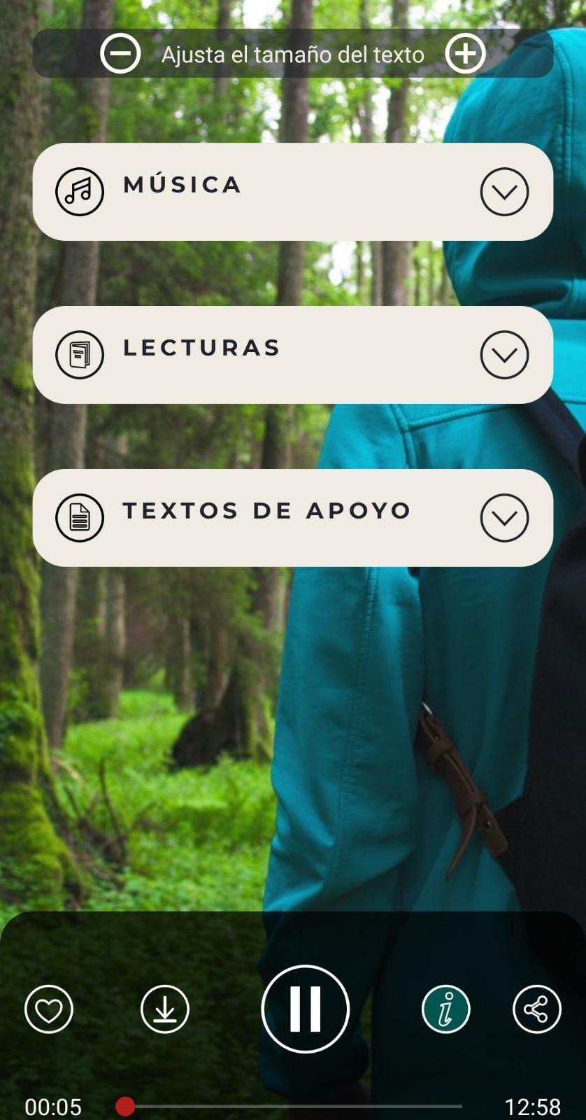 "Ofrecemos una serie de oraciones que están pensadas para el Camino de Santiago y tantas rutas posibles en las que uno peregrina buscando, desde la fe, avanzar por fuera y por dentro", se explica en la presentación del apartado orientado a la ruta con destino final la Praza do Obradoiro. Cada propuesta dura entre 12 y 15 minutos y las oraciones están pensadas para que sean una motivación para cada jornada del Camino, según cuentan los creadores de la app. En cada etapa se ofrece un texto bíblico, música, poemas y "pistas para profundizar en determinadas dimensiones vitales que surgen durante la marcha".