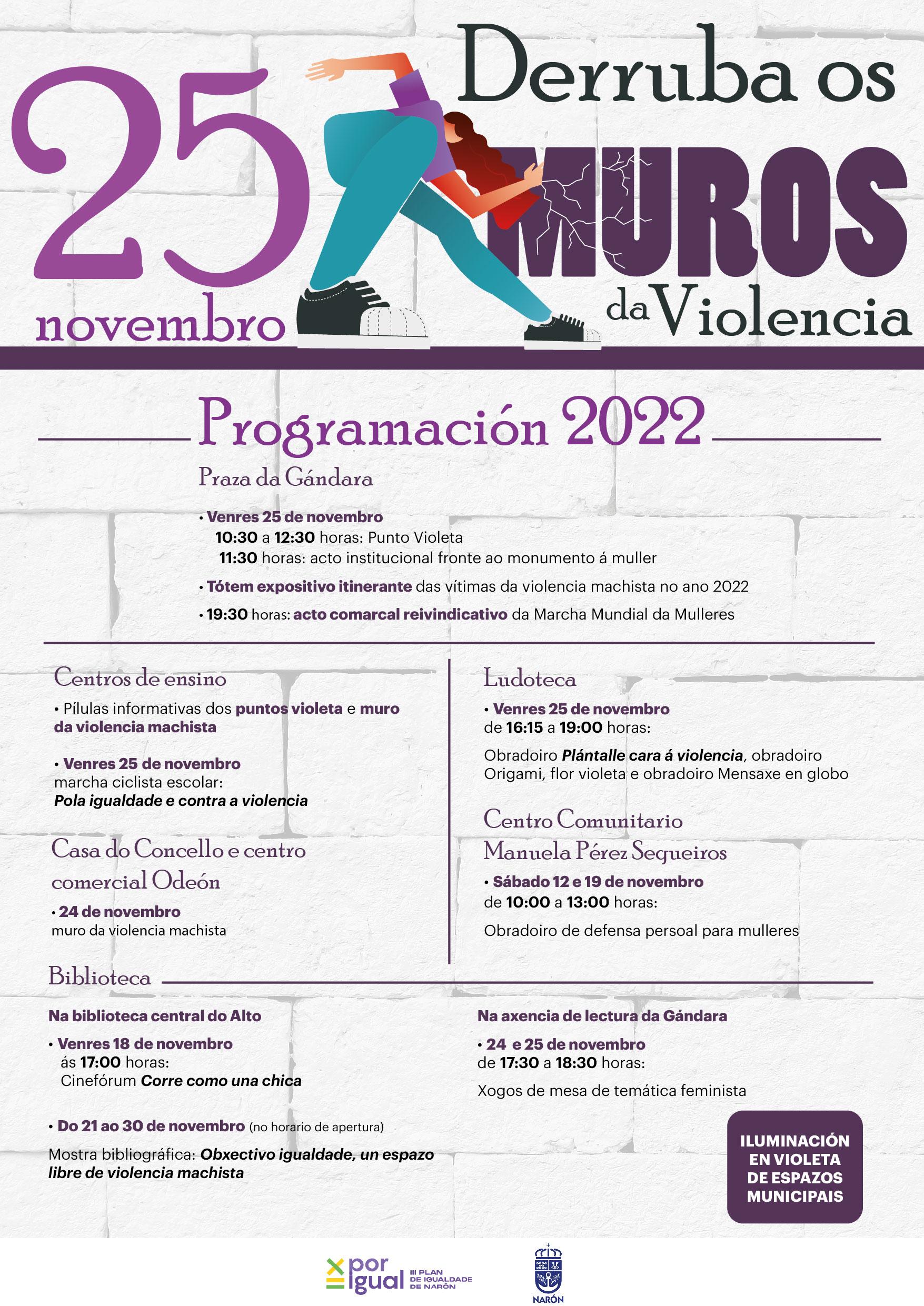 El propio 25-N la actividad se centralizará en la plaza de A Gándara, donde se instalará un Punto Violeta de 10:30 a 12:30 horas y se leerá la declaración institucional a las 11:30 horas, acto que dará paso a una ofrenda floral en el monumento a la mujer. También estará instalado en la plaza un tótem expositivo de las víctimas de la violencia machista en el año 2022. A partir de las 19:30 horas tendrá lugar un acto comarcal reivindicativo de la Marcha Mundial das Mulleres. Los centros de enseñanza también se sumarán a la conmemoración de este día con la marcha ciclista escolar Pola igualdade e contra a violencia.