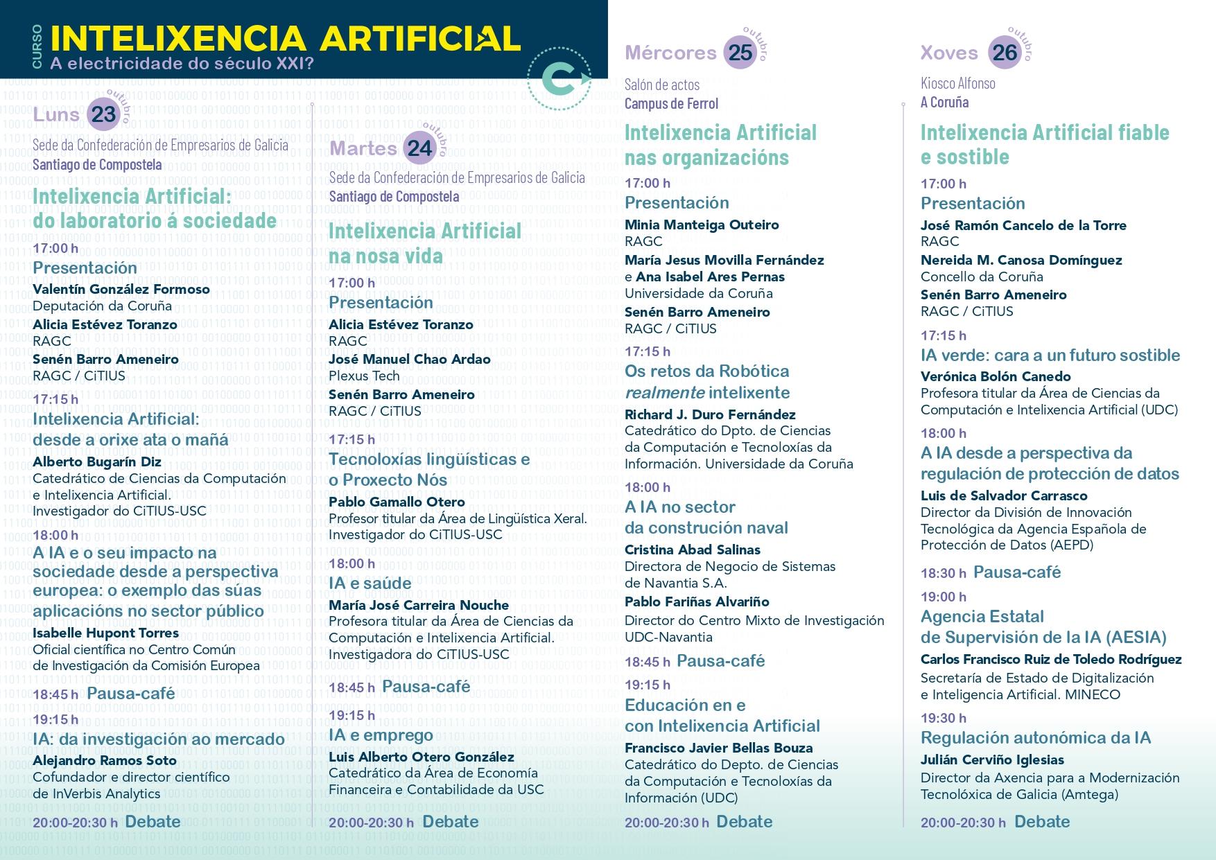 El Campus Industrial de Ferrol acogerá este miércoles, 25 de octubre, un curso sobre inteligencia artificial organizado por la Real Academia Gallega de las Ciencias (RAGC) en colaboración con la Diputación de A Coruña, la Confederación de Empresarios de Galicia (CEG), la UDC, la consultora Plexus y la Xunta de Galicia.