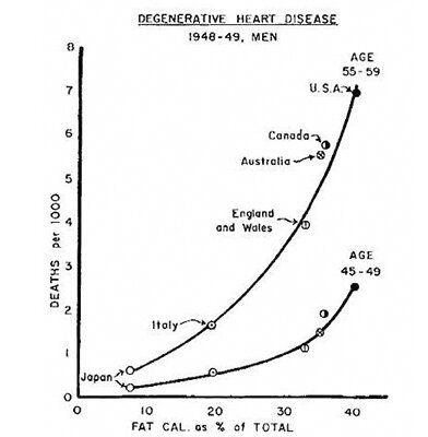 Como muestran los datos de la Organización Mundial de la Salud, las principales causas de muertes en el mundo son las enfermedades cardiovasculares (ECV). ¿Pero qué provoca estas enfermedades? ¿Las grasas? Hace unos 60 años prevaleció la idea de que sí, que las grasas eran las culpables de las ECV. Esta teoría de las grasas proviene de un estudio dirigido por Ancel Keys: el famoso “estudio de los 7 países”. En este estudio, se mostraba una gráfica (abajo) con una inequívoca curva ascendente que situaba a la ingesta de grasas saturadas como responsable de las muertes por ECV.