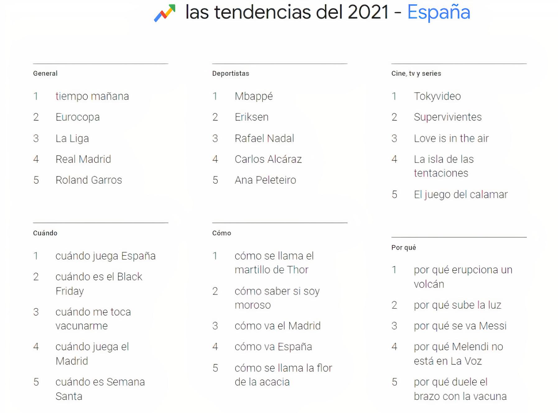 La búsqueda más frecuente en España durante 2021 fue “tiempo mañana” (como si ya no nos preocupase el futuro a medio plazo) y, exceptuando el término “Volcán Palma”, el resto del ranking de las 10 búsquedas más frecuentes giran alrededor del mundo deportivo (lo cual también es para hacérselo mirar).