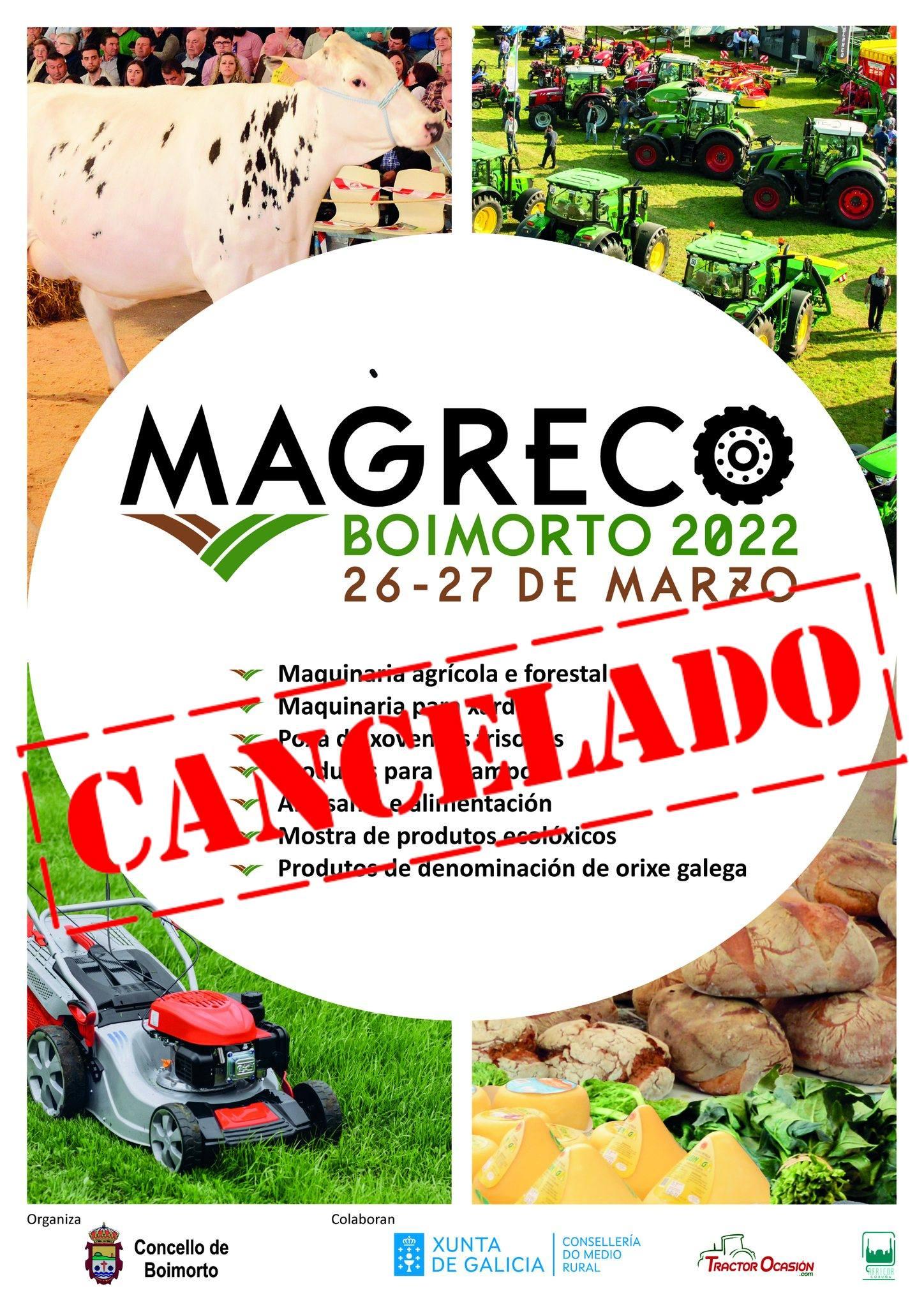 El Concello de Boimorto ha anunciado este martes la cancelación de la feria agroganadera Magreco, cuya celebración estaba prevista para los días 26 y 27 de marzo, debido a la huelga de transportes, que impide la llegada de la maquinaria agrícola y de las novillas para la puja.