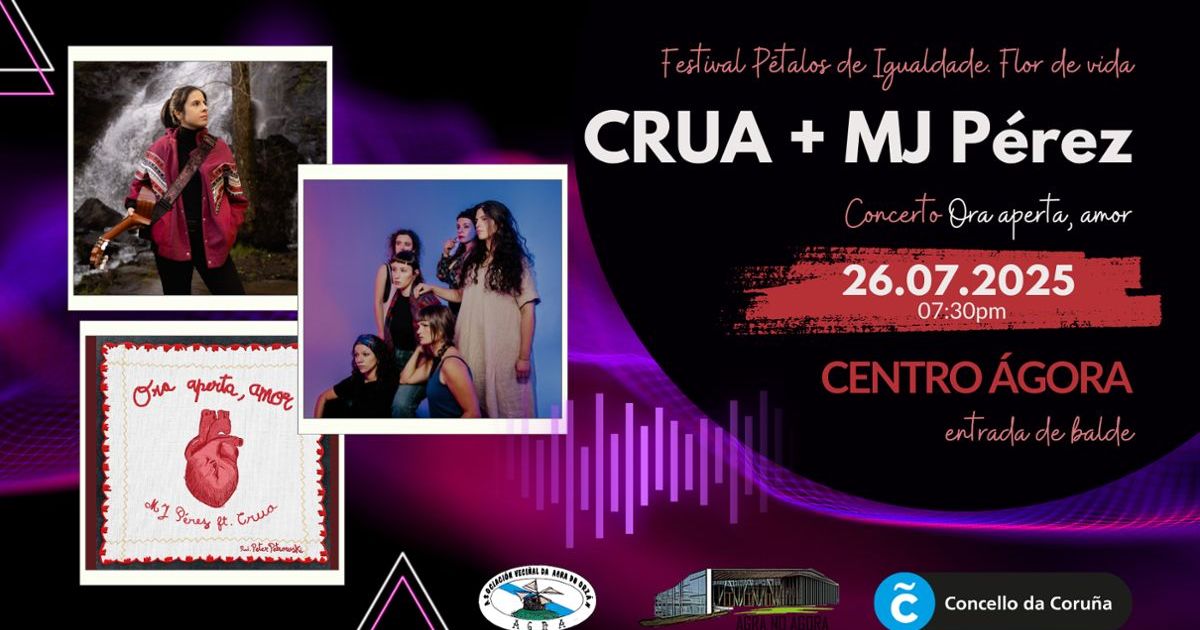 A cantautora MJ Pérez e o grupo portugués CRUA unen voces nun concerto especial. Será a xuntanza destes dous proxectos que nos deleitarán co mellor do seu repertorio e que interpretarán ao vivo ou seu tema en colaboración "Ora aperta, amor".