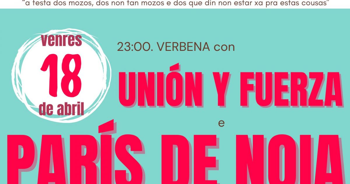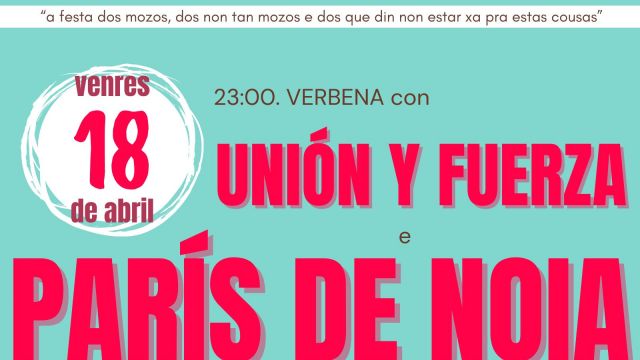 - Baixo o lema "a festa dos mozos, dos non tan mozos e dos que din non estar xa pra estas cousas", a verbena arrancará ás 23:00 horas coas recoñecidas formacións París de Noia e Unión y Fuerza.
