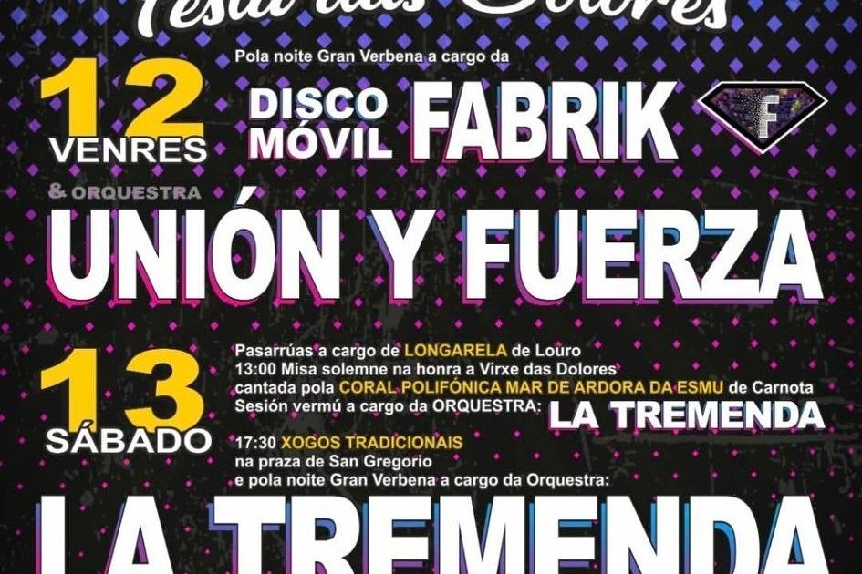 - Noche: Gran verbena con Disco Móbil Fabrik y la orquesta Unión y Fuerza