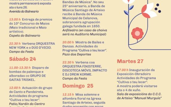 El programa arranca el viernes 23 con la exhibición de los trabajos presentados al X Concurso de Maios do Concello de Arteixo, una muestra que permanecerá abierta hasta el lunes 26 en la Avenida do Balneario. A las 13:00 horas se hará entrega de premios en la Capela do Balneario. Ya por la noche, la fiesta tomará fuerza con una gran verbena a cargo de la orquesta New York y el Dúo D’Vicio en el Campo da Festa.