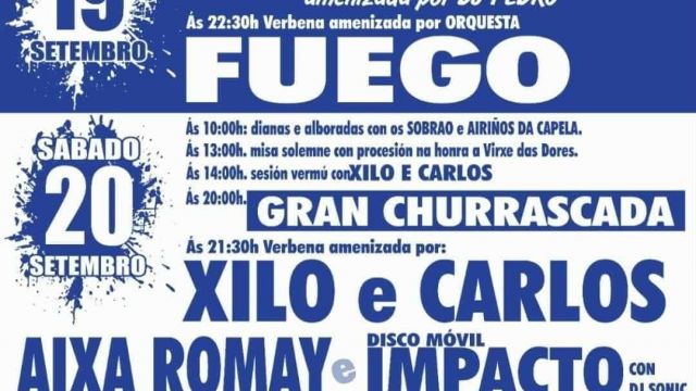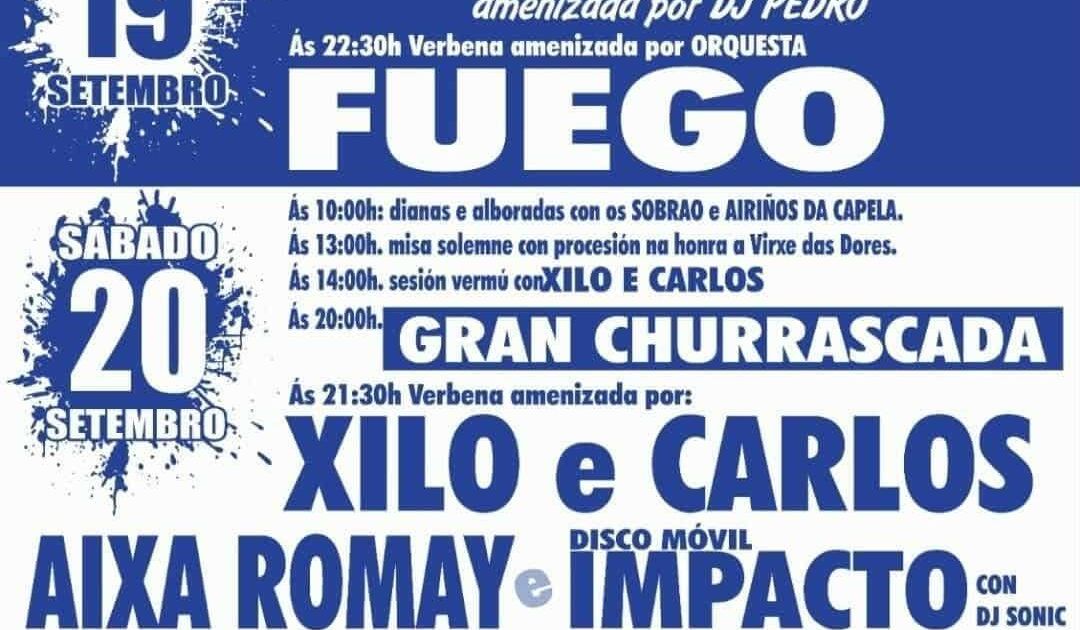 - 21:30 h: Verbena con Xilo y Carlos, Aixa Romay y el Disco Móbil Impacto con DJ Sonic.