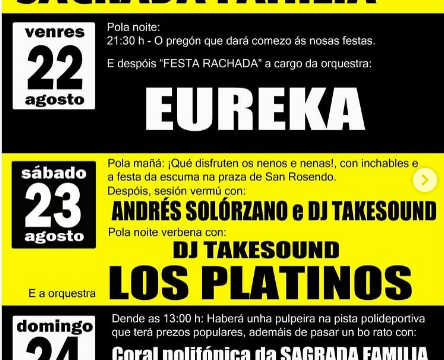 - Desde las 13:00 h: Pulpeira en la pista polideportiva con juegos populares, además de actuaciones de: