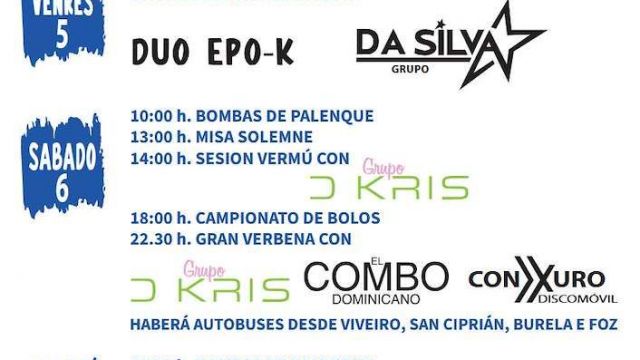 - 22:30 h: Gran verbena con Grupo Kris, Combo Dominicano y Discomóvil Conxuro