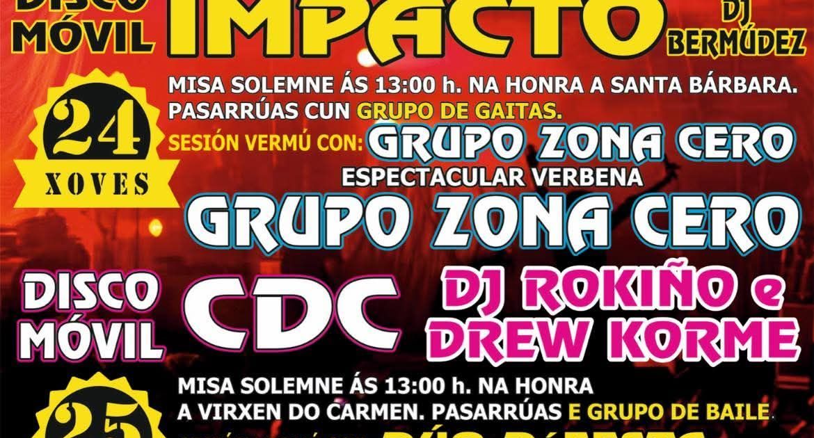 El barrio de Pasarela-Calo celebra sus fiestas con un programa variado que incluye música en directo, misas solemnes, churrascada popular, actividades infantiles y espectáculos con orquestas y discomóviles de primer nivel.