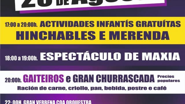 - 20:00 h: Gaiteiros y gran churrascada (ración de carne, criollo, pan, bebida, postre y café a precios populares)