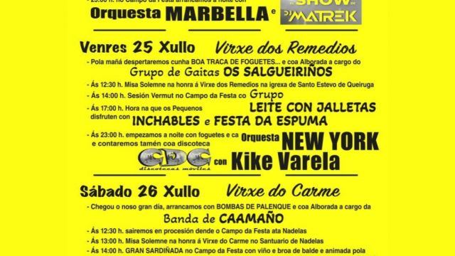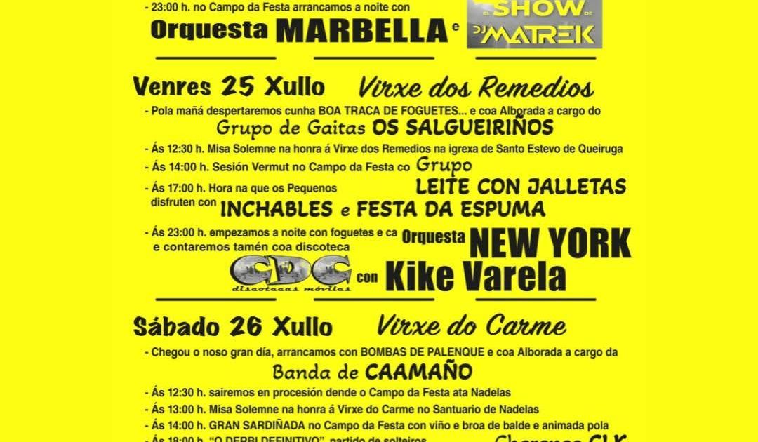 La parroquia de Queiruga celebra sus fiestas con tres intensos días de música, tradición y actividades para todos los públicos, dedicadas a la Virxe dos Remedios y la Virxe do Carme.