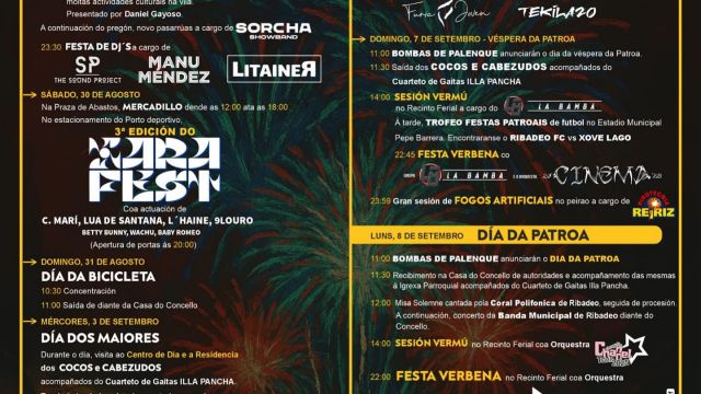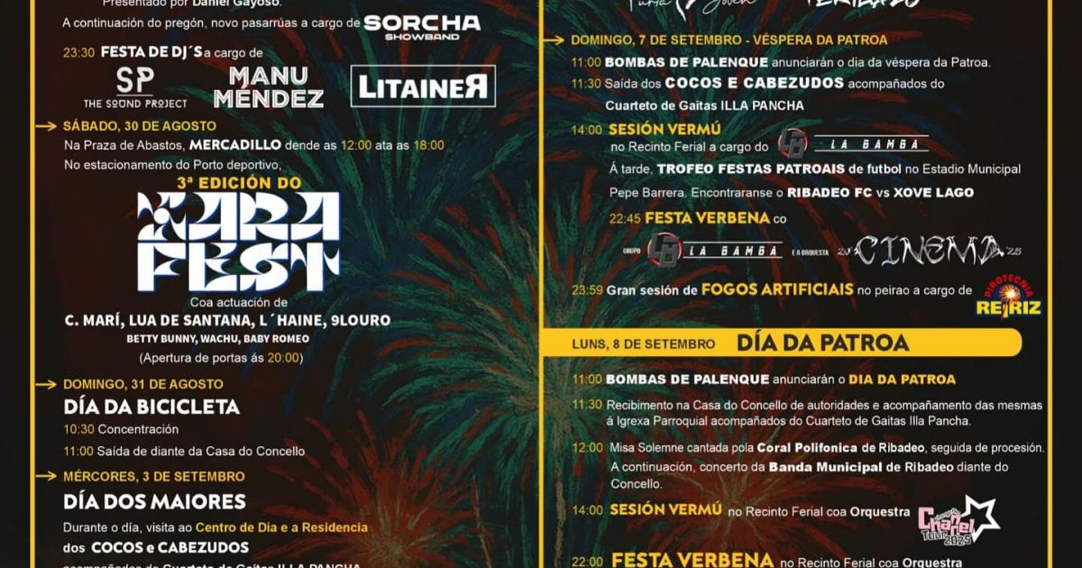 Las Festas Patronais de Ribadeo 2025 se extienden durante más de una semana con un completo programa que incluye pregones, pasacalles, actividades infantiles, deportivas y culturales, además de grandes verbenas con reconocidas orquestas y conciertos internacionales.