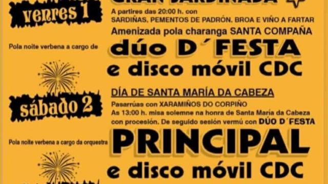 - 13:00h: Misa solemne en honor a Santa María da Cabeza con procesión