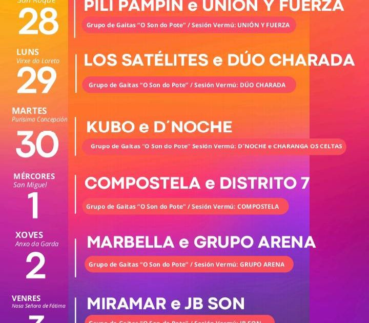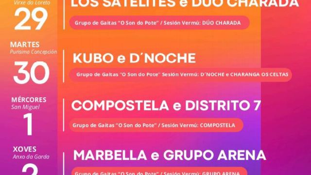 Las fiestas de San Roquiño se celebran con misas, gaitas, sesiones vermú y grandes verbenas con orquestas y grupos musicales.