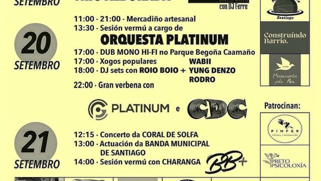 Las fiestas de Fontiñas incluyen mercado artesanal, sesiones vermú, charangas, verbenas, actividades infantiles y conciertos, en un ambiente vecinal y festivo.