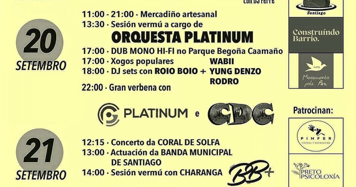 Las fiestas de Fontiñas incluyen mercado artesanal, sesiones vermú, charangas, verbenas, actividades infantiles y conciertos, en un ambiente vecinal y festivo.