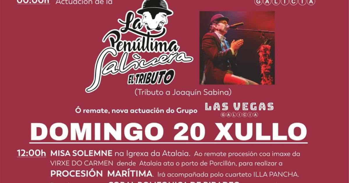- 12:00 · Misa solemne en la Igrexa da Atalaia. Al finalizar, procesión con la imagen de la Virxe do Carme desde Atalaia hasta el puerto de Porcillán para realizar la procesión marítima, acompañada por el cuarteto Illa Pancha.