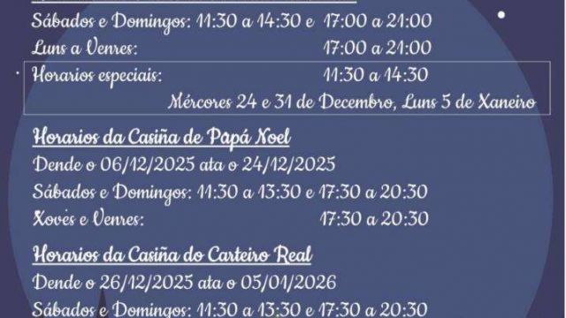 - Días especiales (24 y 31 de diciembre, 5 de enero): 11:30–14:30