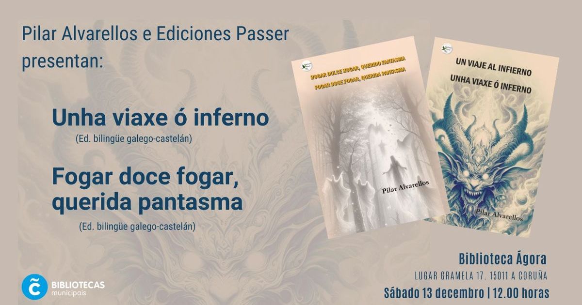 - O sábado 13 de decembro ás 12.00 h terá lugar na aula 2 da Biblioteca Municipal Ágora a presentación das obras "Fogar doce fogar, querida pantasma" e "Unha viaxe ó inferno", ambas da escritora galega Pilar Alvarellos e dispoñibles no catálogo de Ediciones Passer en edición bilingüe galego-castelán.