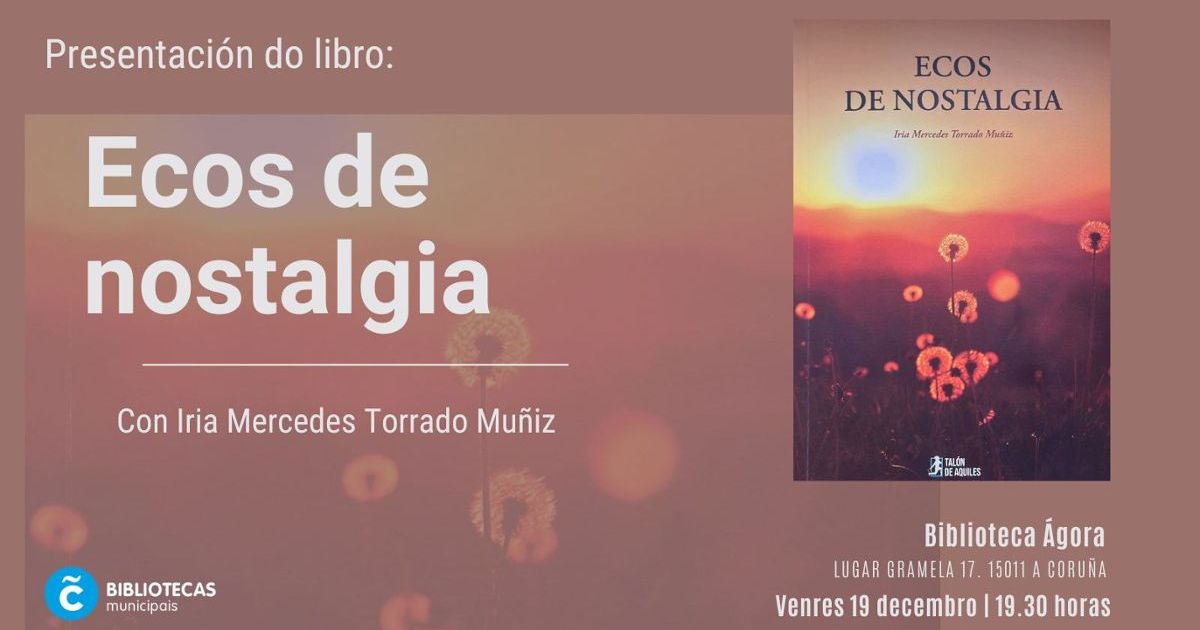 - O venres 19 de decembro terá lugar na Biblioteca Ágora a presentación de "Ecos de nostalgia", o primeiro libro da autora galega Iria Mercedes Torrado Muñiz.
