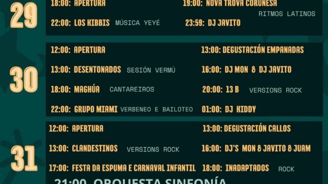 - 19:00 h: Concierto de Nova Trova Coruñesa (ritmos latinos)