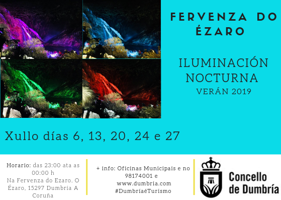 Hoy, además, vuelven sus conocidas iluminaciones nocturnas. Cada sábado por la noche, de once a doce, la cascada se iluminará de distintos colores. Esto dará lugar a una bellísima estampa, muy fotografiable para los visitantes. En julio habrá sesión los sábados 13, 20 y 27, además de la noche del 24, víspera de Santiago Apóstol.