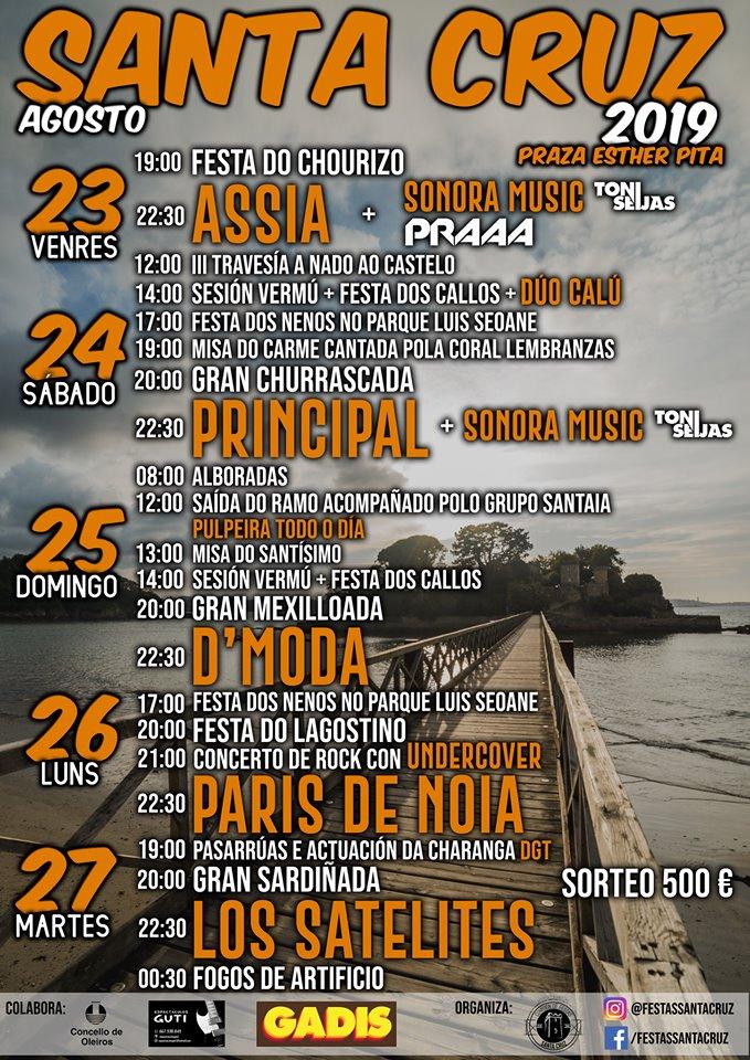 Los principales reclamos musicales serán la París de Noia y Los Satélites, que estarán el 26 y 27 en el centro de Santa Cruz, a escasos metros del castillo. Además, durante los cinco días de fiestas también actuarán las orquestas Assia, Principal y D’Moda. El viernes y el sábado la verbena también estará amenizada por el dj Toni Seijas.